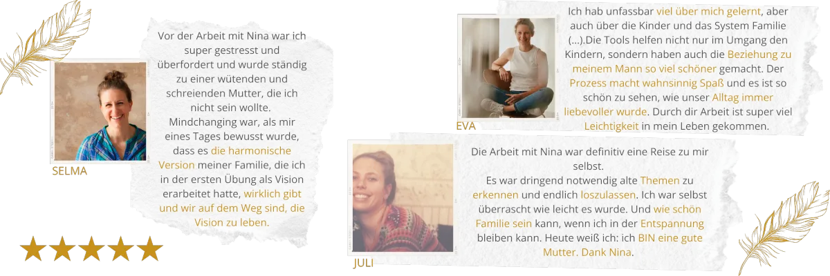 Bewertung ohne vorherige EinladungMir hat es super geholfen, den Struggle in unserem Familienalltag besser zu verstehen, zu sortieren und am richtigen Ende anzupacken. Ich war früher in meiner Wut gefangen, wegen Kleinigkeiten bin ich auf die Palme gekommen. Nina hat mir geholfen zu verstehen und zu verändern.
